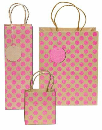 Glitter Gift Bag Neon Kraft Spots Pink (select size)